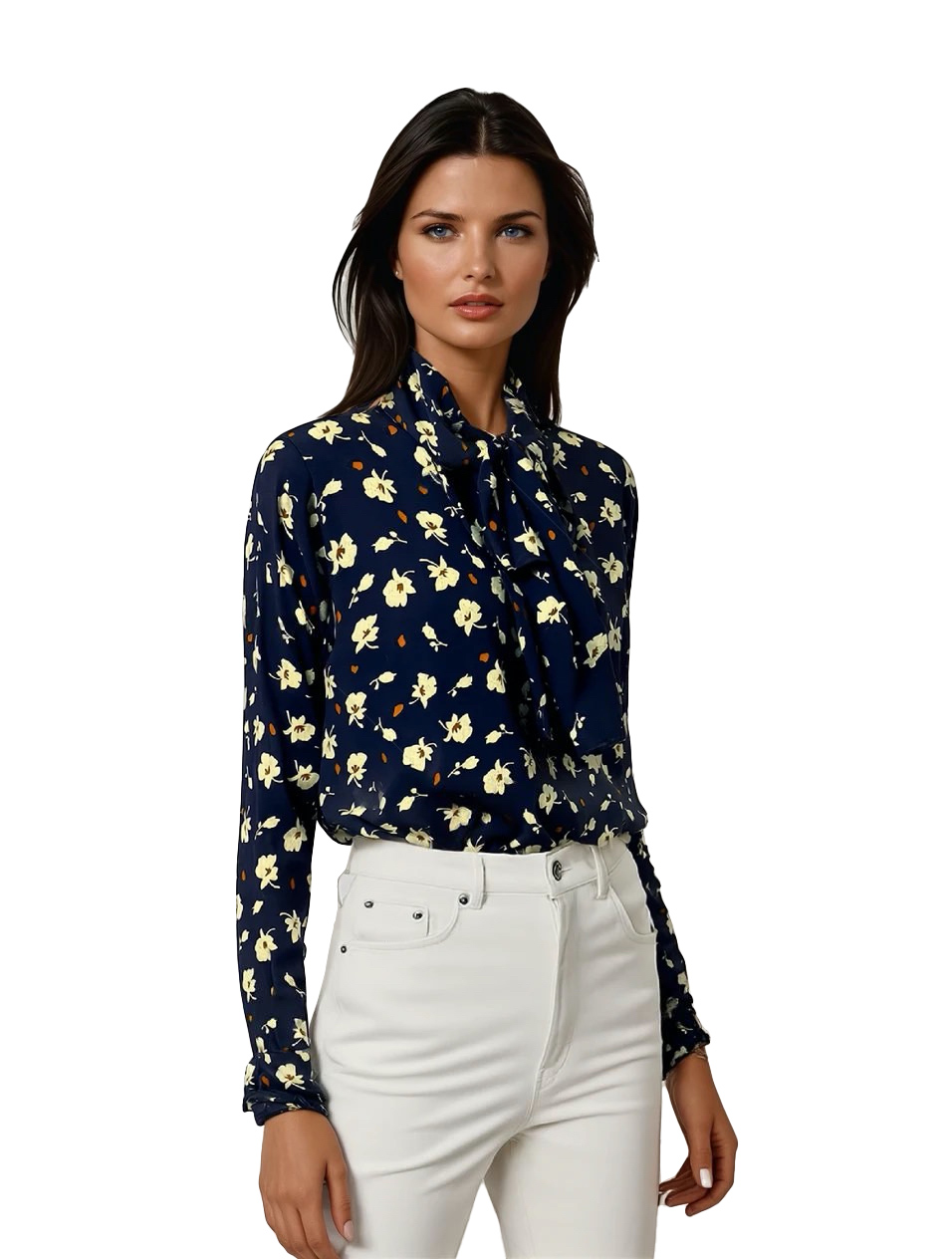 Ženska unikatna bluza z vzorcem rožic. Okrog vratnega izreza je trak, ki se lahko zaveže v mašljo za bolj eleganten videz. Bluzica ima dolgi rokav z elastiko v zapestju. Dolžina bluze je zaključena z gumico.