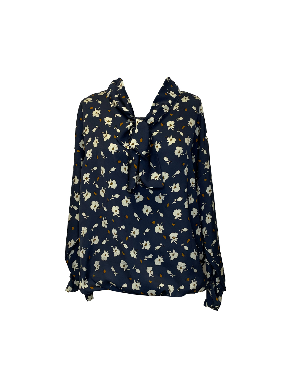 Ženska unikatna bluza z vzorcem rožic. Okrog vratnega izreza je trak, ki se lahko zaveže v mašljo za bolj eleganten videz. Bluzica ima dolgi rokav z elastiko v zapestju.