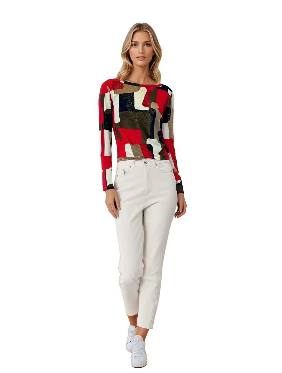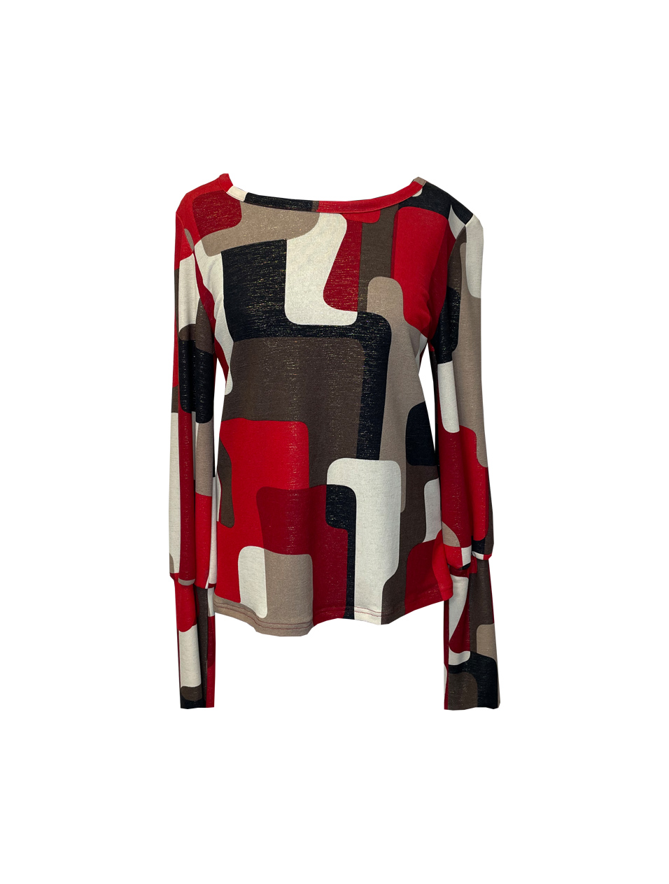 Unikatna ženska majčka Mozaik z dolgimi rokavi. Lep poletni vzorec različnih barv. Okrogli vratni izrez, izrazito dolgi rokavi s širokim patentom istega vzorca. Močno raztegljiv material z diskretnimi zlatimi nitkami.