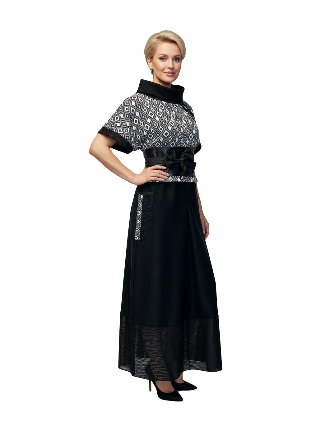 Poseben čar obleki daje zaključek iz mreže in tafta, ki poskrbi za moderen in ženstven videz.